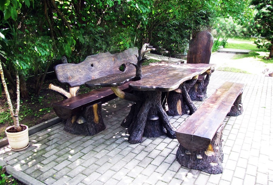 Вся мебель выполнена из художественного бетона ручной лепки (основание), бревна не менее 35см, доска обрезная не менее 10см.