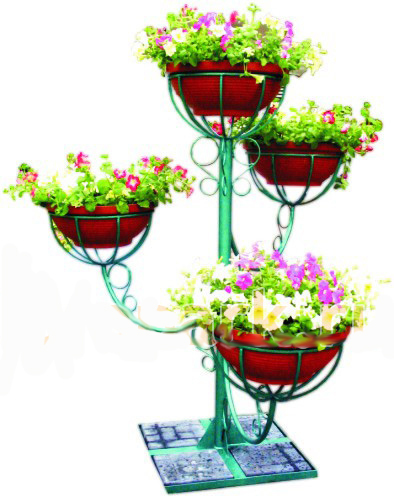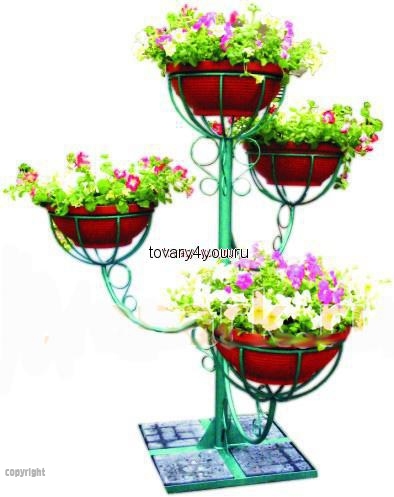 конструкция цветочницы с центральной стойкой и прикрепленными к ней изогнутыми боковыми консолями с элементами художественной ковки и корзинами для размещения в них термо-чаш. Основание: металлическая рама под тротуарную плитку.