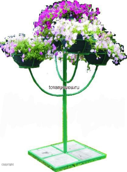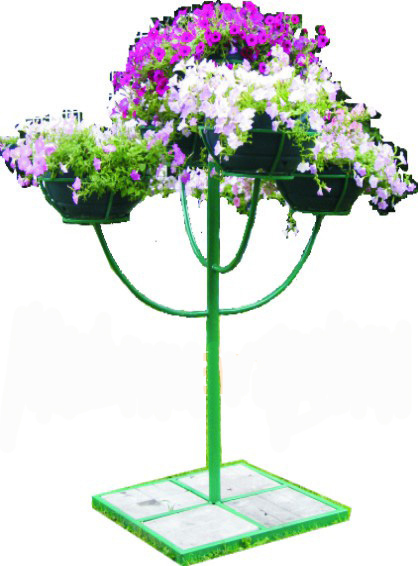 Цветочница "Сирень" представляет собой конструкцию с центральной стойкой и прикрепленными к ней боковыми консолями на двух уровнях перпендикулярно друг другу, с декоративными корзинами и размещенными в них термо-чашами.
