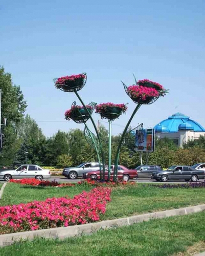 Конструкция цветника, вазоны для цветов с запасом воды, основание: анкерное соединение или металлическая рама под тротуарную плитку.