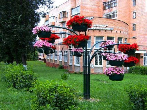Конструкция цветника представляет собой 9 изогнутых консолей с вазонами для цветов с запасом воды.