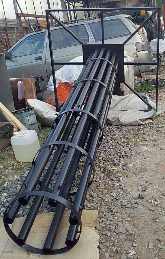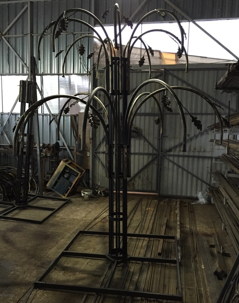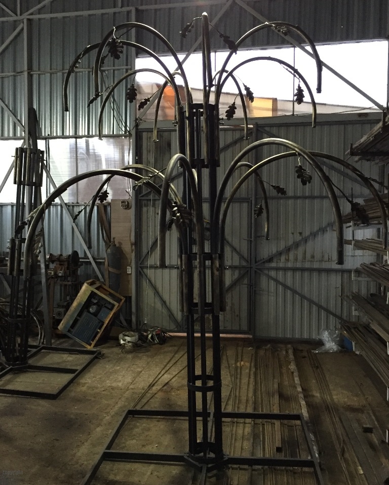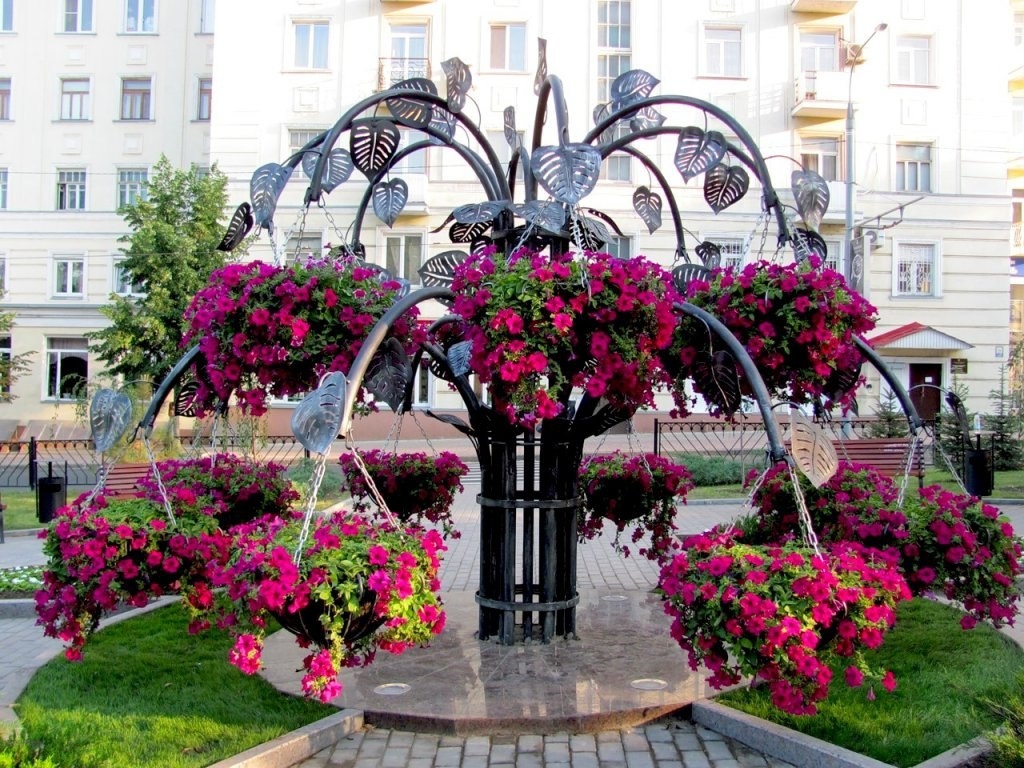 Конструкция цветника представляет собой конструкцию из 10 или 16 консолей с 2-мя листиками на ветке, вазоны для цветов с запасом воды в двойном подвесе.