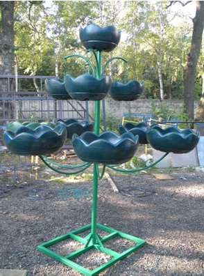 конструкция цветочницы, вазоны для цветов с запасом воды, основание - металлическая рама под тротуарную плитку.
