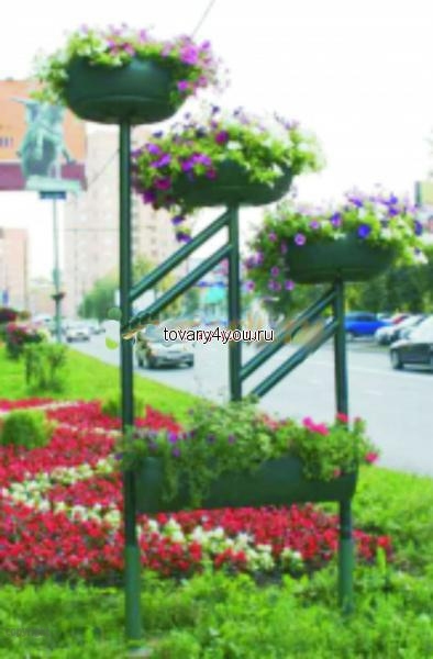 Комплектация цветника: конструкция цветочницы, вазон для цветов с запасом воды, уличные ящики для цветов с запасом воды, основание - анкерное соединение.