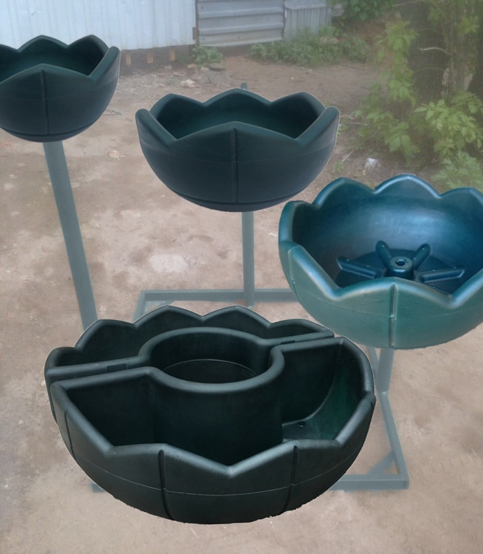 Конструкция цветника, вазоны для цветов с запасом воды, в основании - металлическая рама.