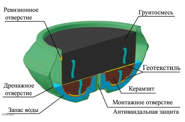 Вазон для цветов с запасом воды изготовлен из сертифицированного полиэтилена